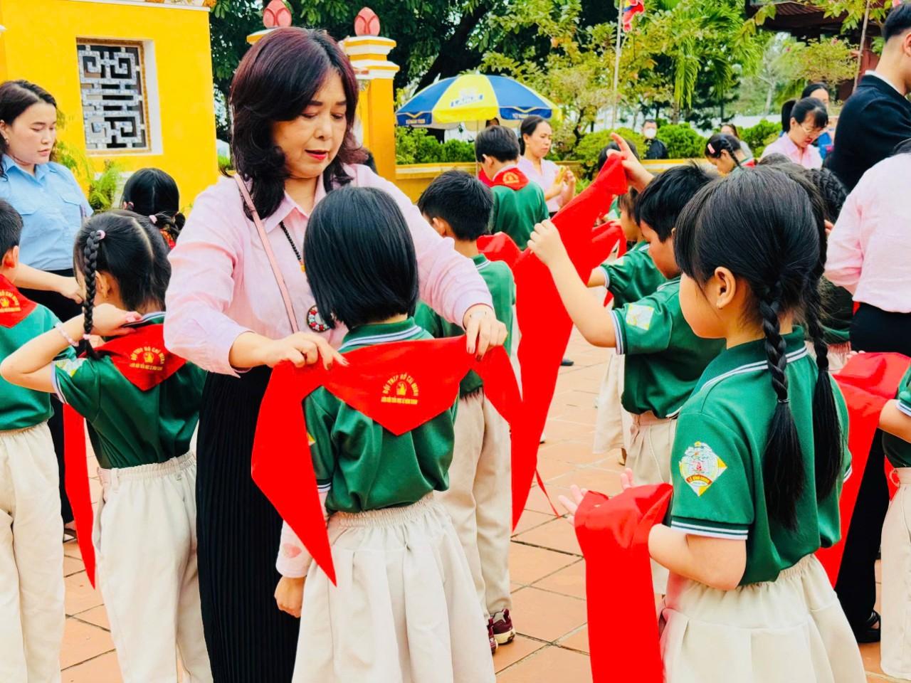 Sau khi được các thầy cô trao khăn quàng đỏ trên vai, một biểu tượng thiêng liêng của người đội viên, tất cả 134 đội viên mới đặt tay lên ngực trái đọc lời hứa đội viên, đây sẽ là dấu mốc đáng nhớ trong chặng đường rèn luyện và trưởng thành của các em.